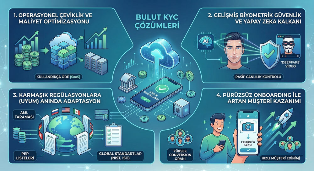 Ancak finans sektöründe hızı artırmak, güvenlikten ve yasal uyumluluktan (compliance) ödün vermek anlamına gelemez. Tam aksine, dijital kanalların artması, kimlik sahtekarlığı ve siber saldırı risklerini de beraberinde getiriyor. İşte bu zorlu denklemde kurumların imdadına, geleneksel sistemlerin hantallığını ortadan kaldıran “Bulut Tabanlı Kimlik Doğrulama (Bulut KYC)” teknolojileri yetişiyor.